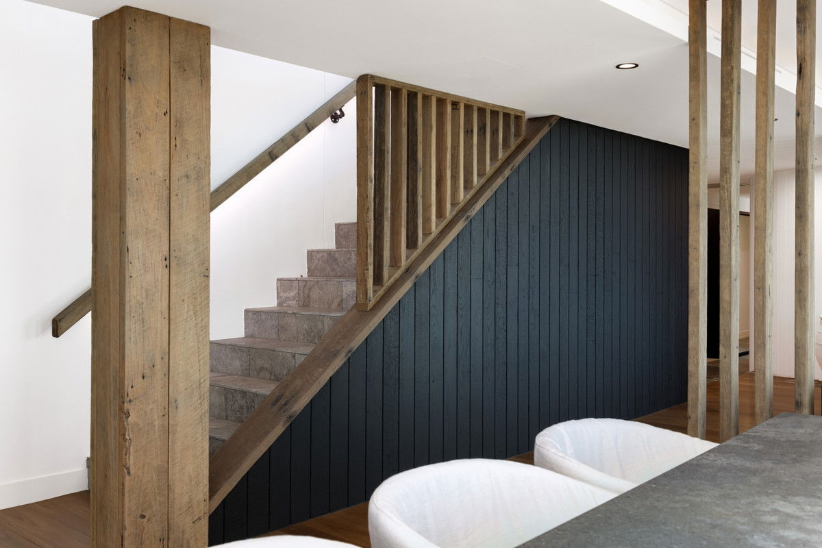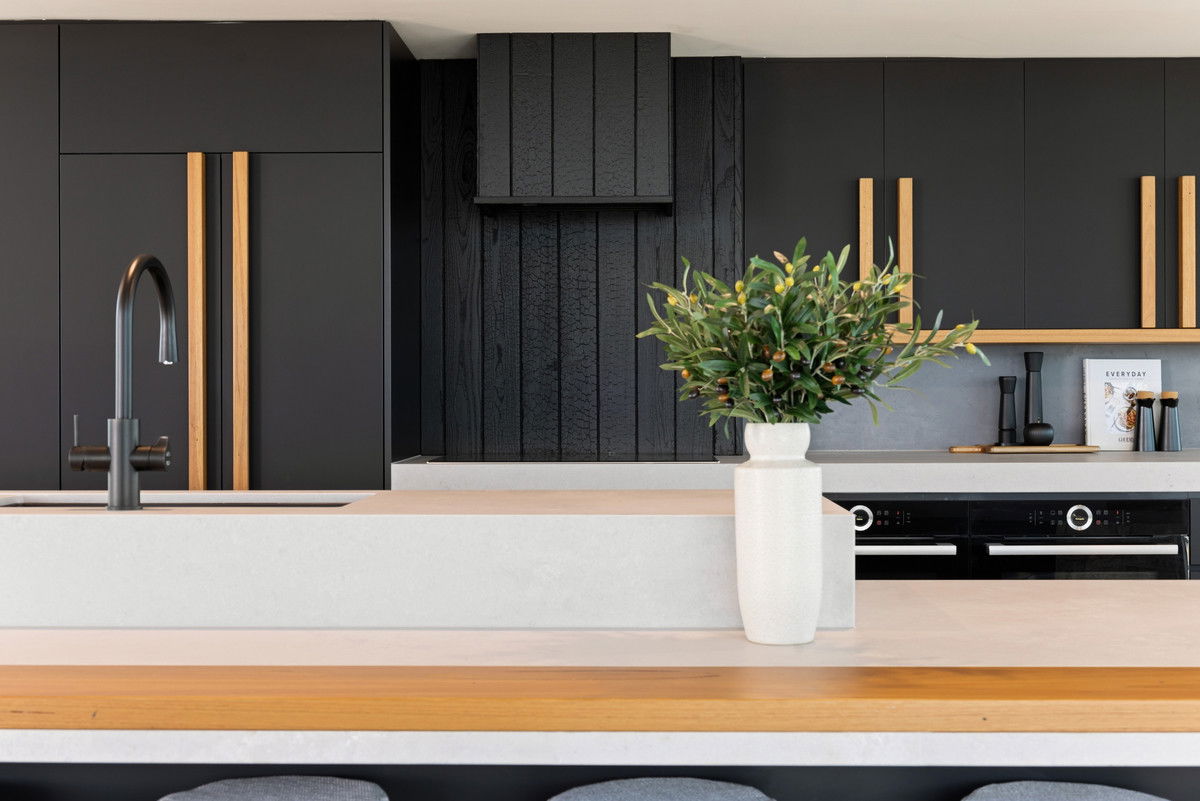 – Concrete-style benchtops and minimalist kitchen with dual ovens and integrated appliances