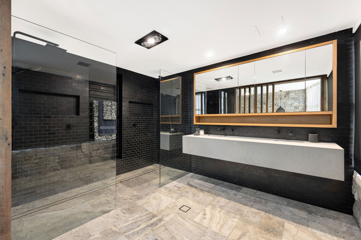 – Travertine floors, floating timber detailing and stone feature walls that deliver timeless texture and warmth