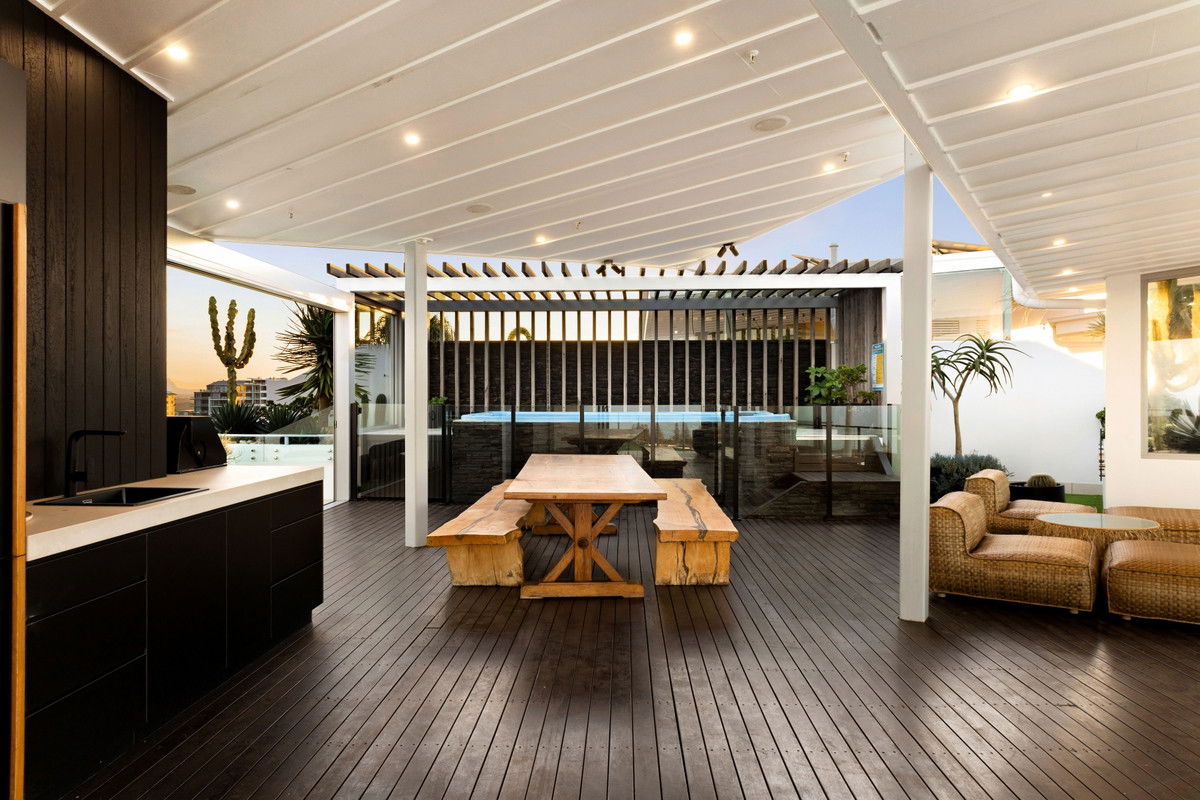 A carefully considered palette of timeless timber and natural stone delivers warmth, texture and elegance throughout. The interiors unfold around a sunken lounge and expansive open-plan living and dining zones, where travertine floors ground the space and recessed lighting softens the tone. The kitchen is clean and minimalist, featuring a concrete-style benchtop, integrated appliances, dual ovens, and sleek cabinetry that keeps the focus firmly on the view.
