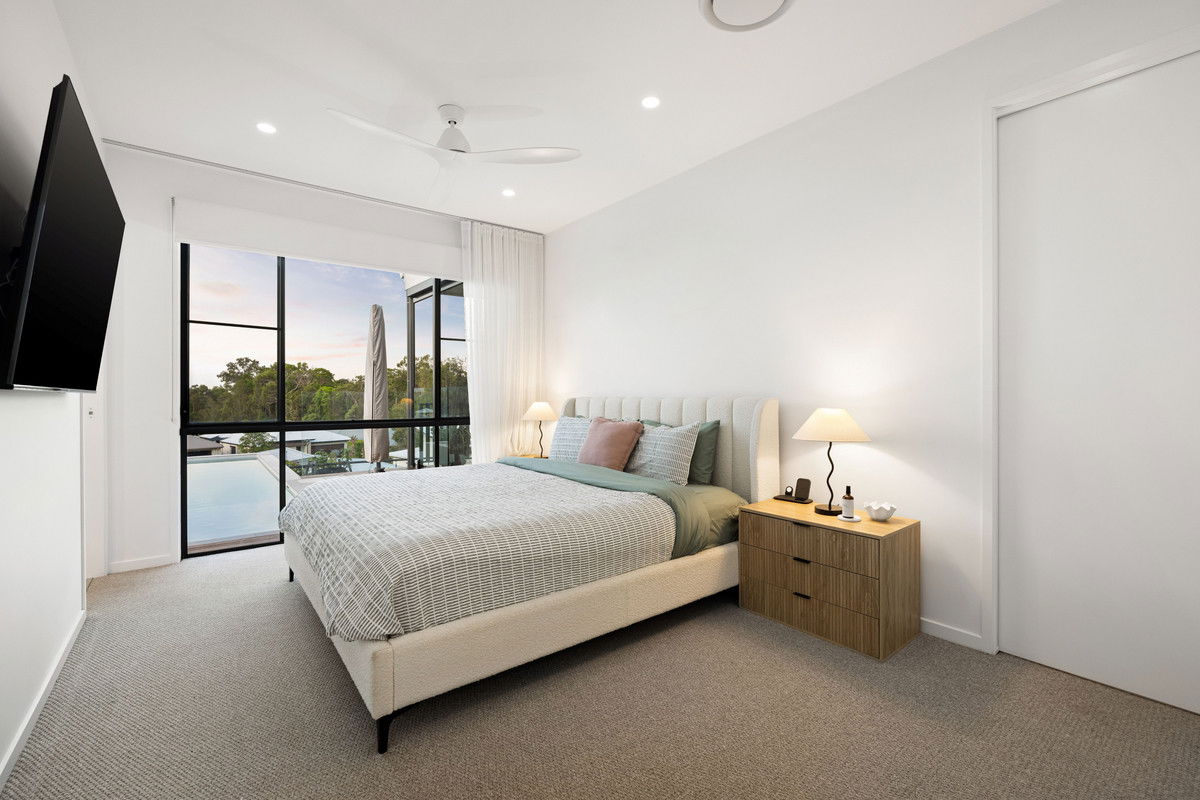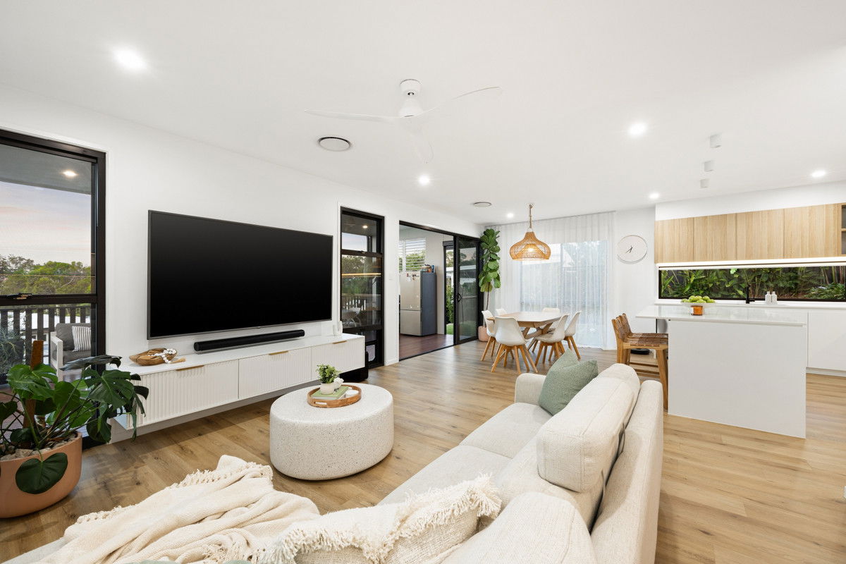 Inside, the home features an open-plan living area where the kitchen flows seamlessly into the outdoor entertaining space. This is a true chef’s dream kitchen, complete with high-end appliances, sleek finishes, and a 5m long walk-in pantry to make entertaining a breeze. The seamless integration of the kitchen with the poolside deck ensures that meal prep and hosting guests is a natural, effortless process.